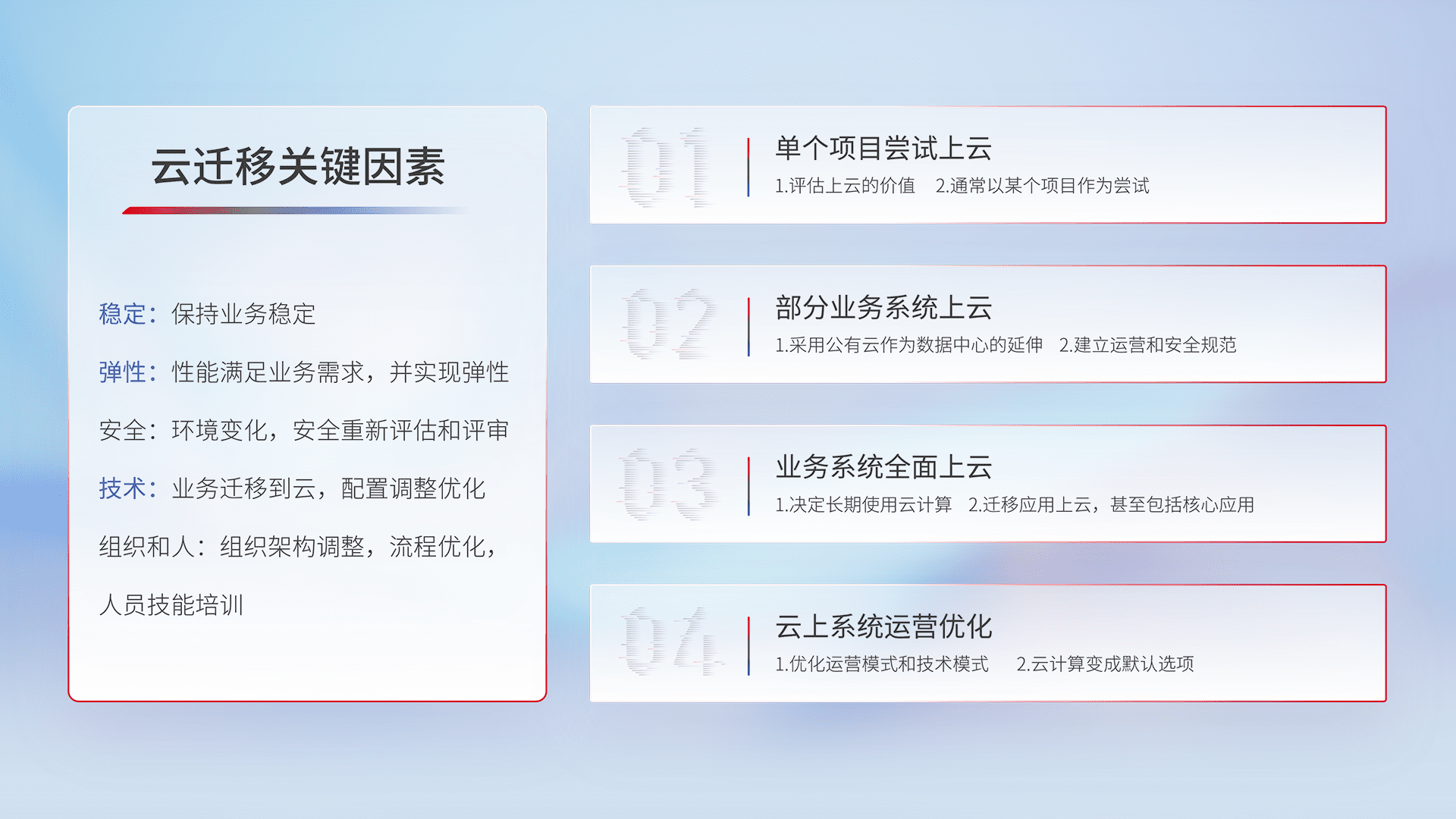结合实际业务,,,,从规划设计、、、云平台选型、、云原生改造、、数据迁移、、、集成交付,,,迁移全过程为客户识别最佳上云路径,,做好风险识别管理,,设计网络架构、、、身份权限、、、、安全审计合规、、、、操作审计、、、日志审计、、、监控告警策略、、、、多站点容灾设计等,,,,对云上基础设施进行整体规划,,,,提升IT治理水平,,,,以满足弹性、、高可用、、高性能的需求。。