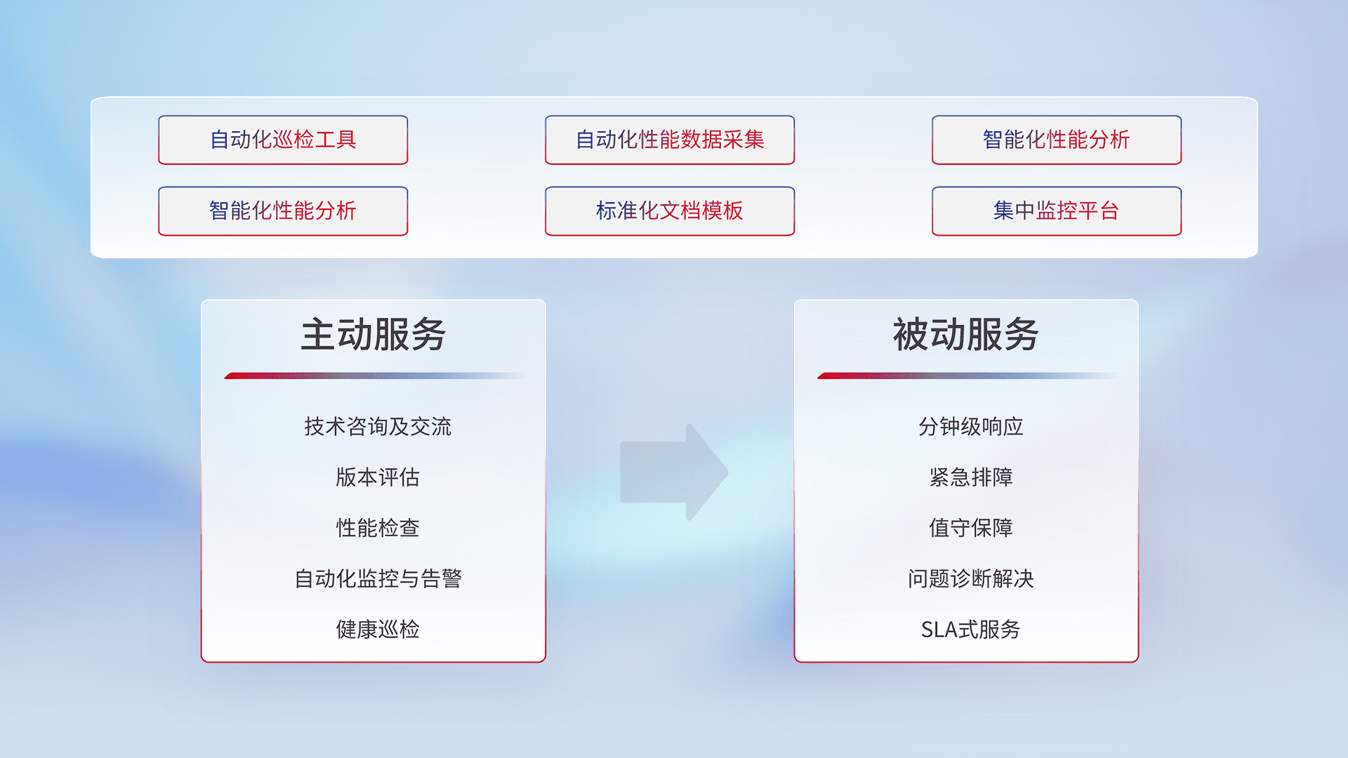 智能化工具和标准化文档,,,,保障服务质量,,,,提供主动服务(包含技术咨询、、版本评估、、、性能检查、、、、自动化监控与告警、、、健康巡检)和被动服务包含(分钟级响应、、、、紧急排障、、、值守保障、、、、问题诊断解决、、SLA服务)。。。